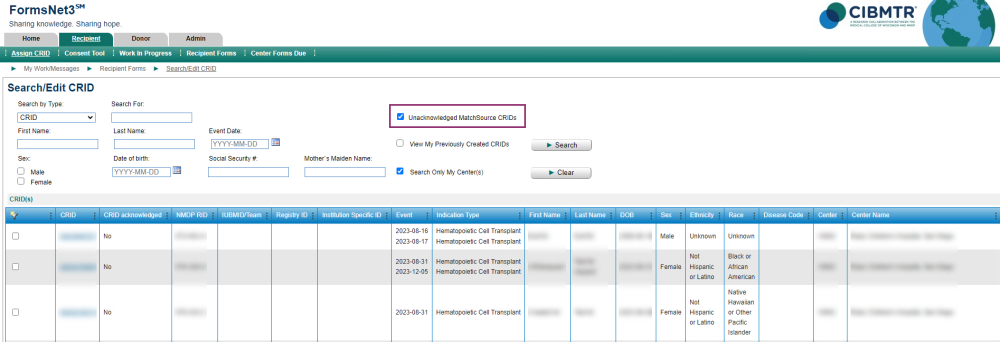 For all MatchSource infusions, whether a new CRID was created or not, FormsNet3 will have inserted and attempted to complete a F2814 (Indication for CIBMTR Data Reporting)