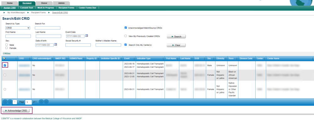 To use Search/Edit CRID normally, unselect the “unacknowledged” filter