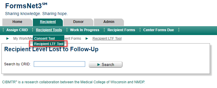 The Recipient LTF Tool can be found by selecting the recipient tab, selecting Recipient Tools, and then selecting Recipient LTF Tool. Then, enter the CRID in the search box.
