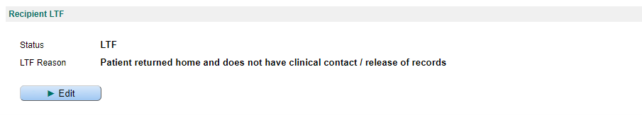 This grid will display the current LTF status for the recipient. Selecting the edit button will allow the recipient to be marked LTF or changed to Active if the recipient’s current status is LTF.