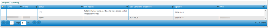 This grid is an audit trail of any changes that have been made to the recipient’s LTF status. Each time a change is made, a new row will appear in the history grid.