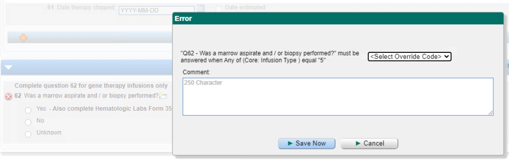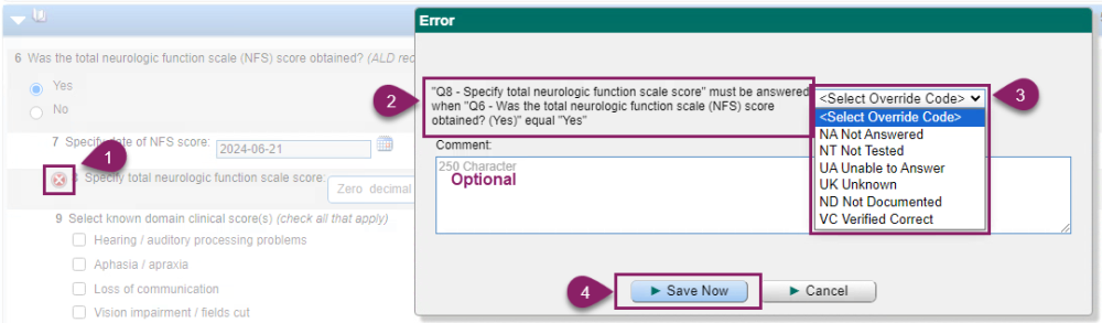 - Once an override code is selected, click ‘Save Now’ and the error will be resolved, and the error icon will clear.