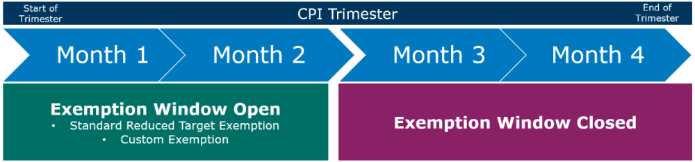 Automatic exemption is granted if a CPI form completion target is missed by a single form or less than a 1% difference in one metric and all other criteria are met. Centers do not need to submit an exemption request for this exemption type. This exemption is granted after final review of trimester standings by CIBMTR leadership. This automatic exemption may not be granted if any exemption(s) were granted during the previous trimester.