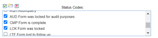 - Click Status Codes “AUD, CMP, LCK, QRY, & PND” (These are the form statuses that are considered “complete for CPI”)
