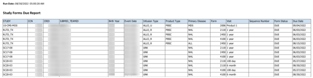 The Corporate Studies and Registries Forms Due List is automatically sent each Tuesday via email to current Primary Data Managers and staff we’ve been asked to copy on correspondences sent to the primary data manager role. If you have questions about forms in these reports, contact CIBMTR Center Support.