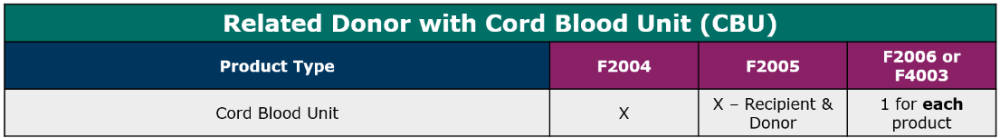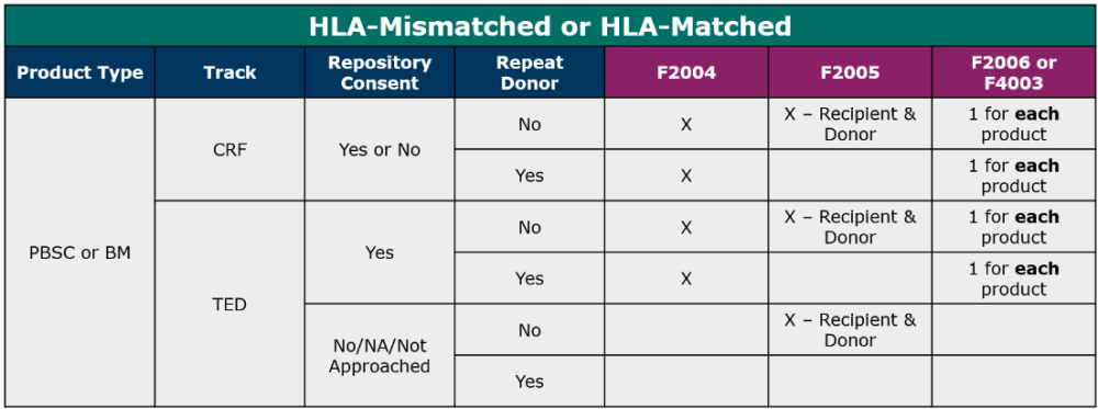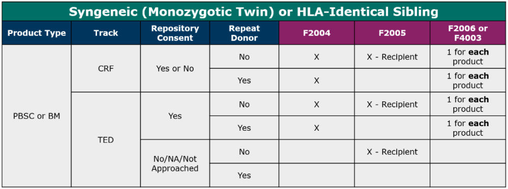 Use the table below to determine which forms can come due for an allogeneic related donor infusion. First, identify donor type in the green heading (syngeneic, HLA matched or mismatched, cord blood unit). Next, identify reporting information in the navy blue columns (product type, track, repository consent, repeat donor). Then, use that information to determine forms generated in the red columns (F2004, F2005, F2006 or F4003). Some key questions from F2400 to keep in mind when determining how forms come due for allogeneic related donor infusions include “Consent for research repository” and “Was the donor used from any prior HCTs?”