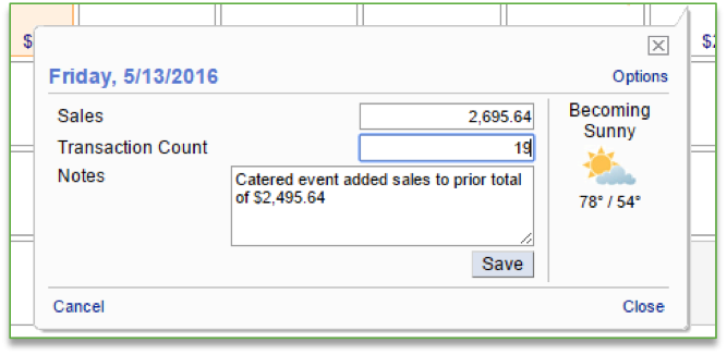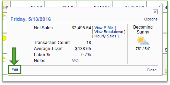 The Edit Sales feature is typically used when sales need to be adjusted for a specific day or set of days. It can also be used to add ntoes for selected days.
