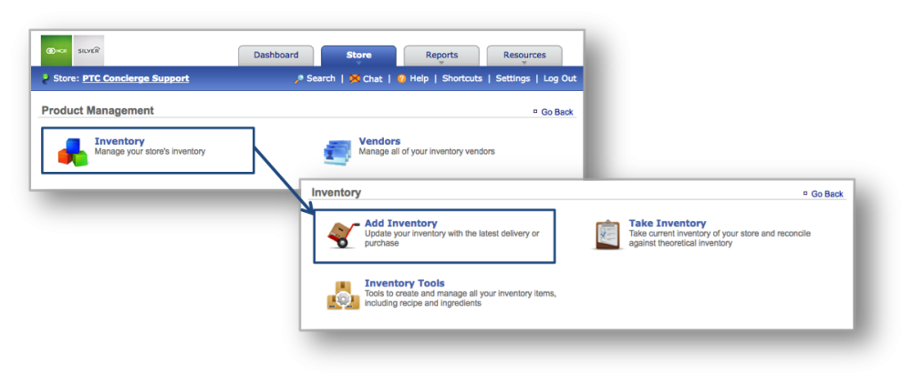 STEP 2: From the Product Management screen, click Inventory. Select either Take Inventory or Add Inventory.