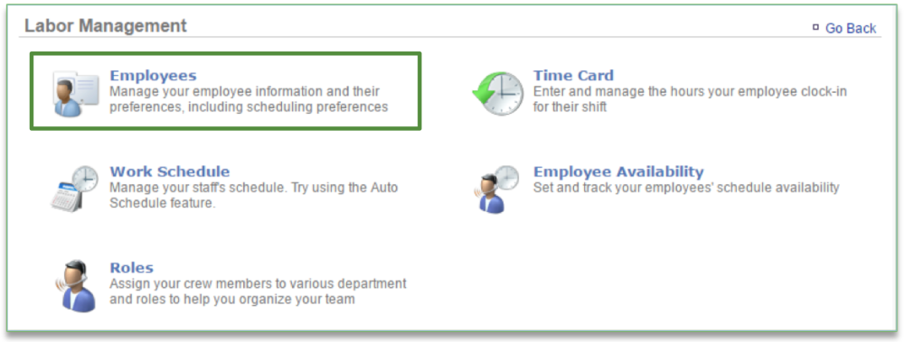 To inactivate an employee, you will need to navigate to the Labor Management module and click Employees.