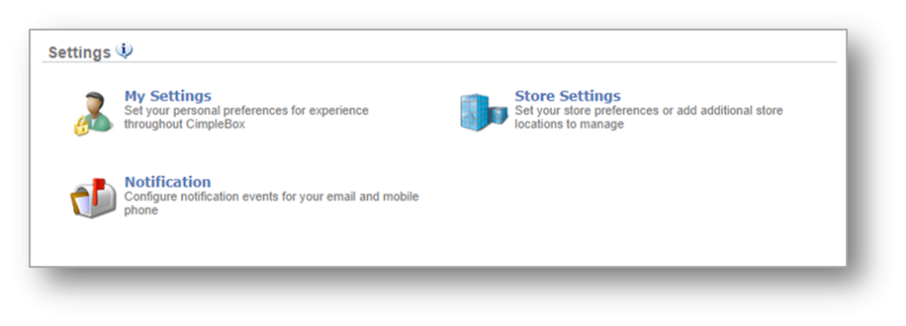 This section will illustrate how to manage your personal, store and notification settings. Click on a topic below for more information.
