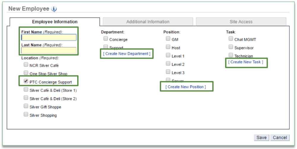 - Enter the employee first and last name (these are required fields)