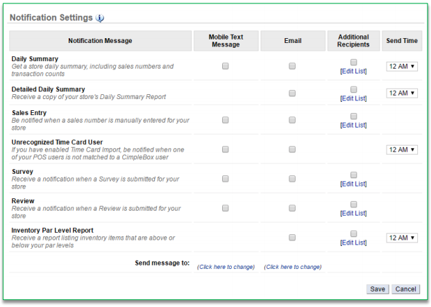 - Under the Mobile Text Message column, check the boxes to the right of each report that you wish to receive notifications for