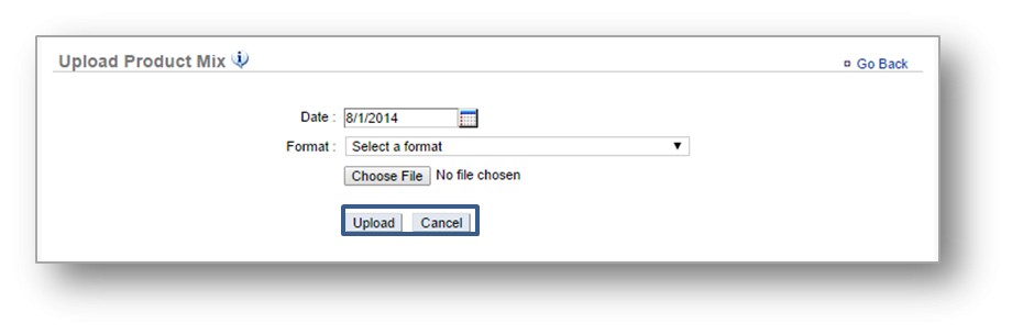 To upload a product mix, click Upload Product Mix. From the window that opens, select the desired date and choose your format. Next, click* _Choose File_* to upload your file from your computer and click Upload.