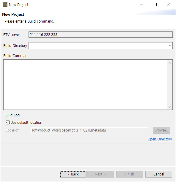 The default location is the .metadata directory of the workspace. If you uncheck [Use default location], you can change the path. - After entering the required information for the build, click the [Next] button. It builds the source file on the target server with the entered build command (depending on the build target, it can take a lot of time).