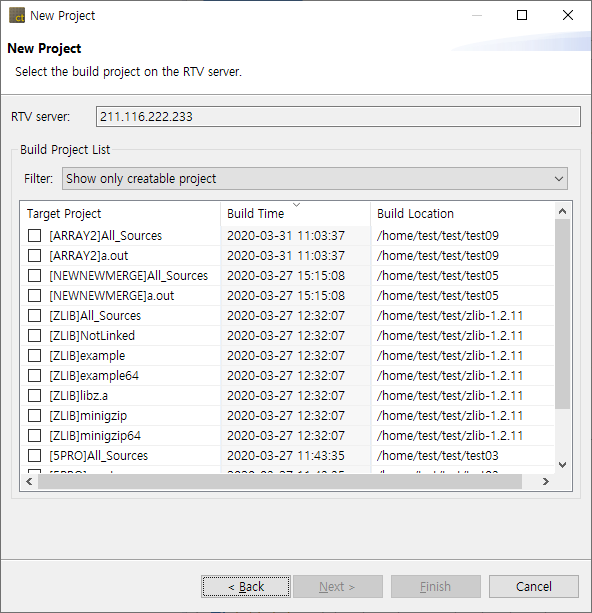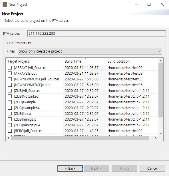 - After selecting the toolchain, then click the [Next] button. You can see the list of source file builds pre-extracted from the target server.