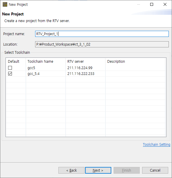 - A list of target toolchains appears in the [Select Toolchain]. Select the RTV toolchain to use.