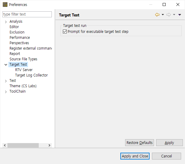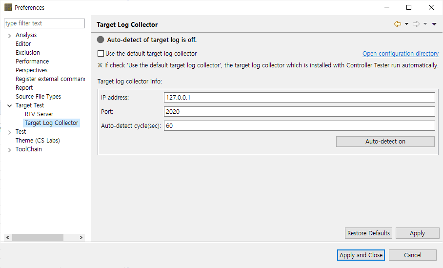 Set target log collector information to use and whether to automatically detect target test results. If you turn on automatic target log detection by clicking the [Atuto-detect on] button, a new target test result is received from the target log collector at a specified automatic detection cycle.