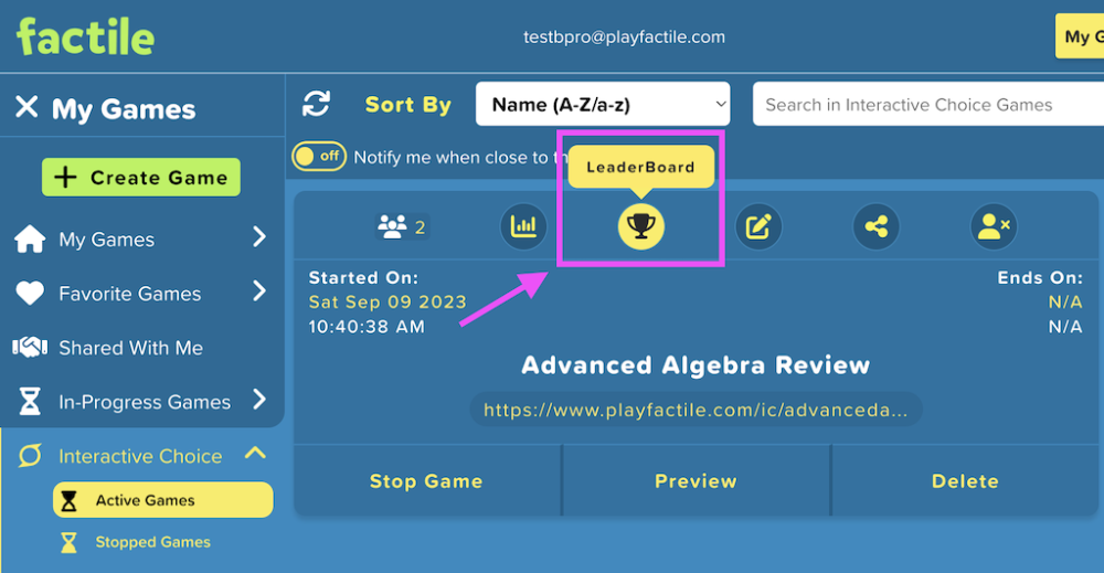 You can click Stopped Games to view Interactive Choice Games that have been deactivated. Here, you can still access certain features such as the Leaderboard and Analytics report.