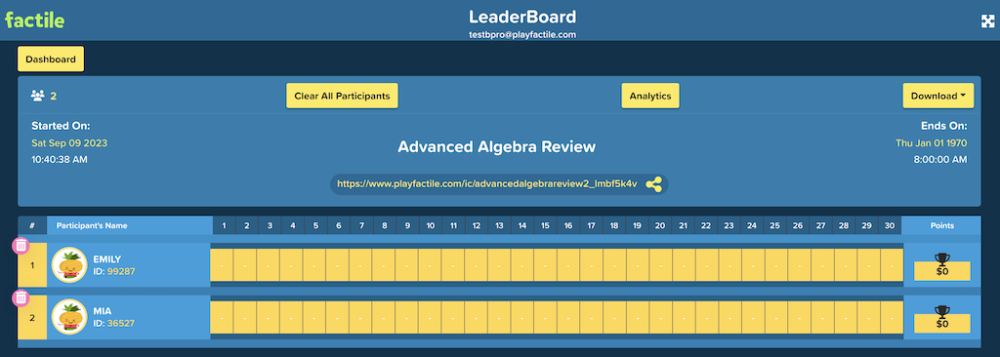 Essential Controls – Options to Clear All Participants, View Analytics, Download Data, and Share the Game Link.