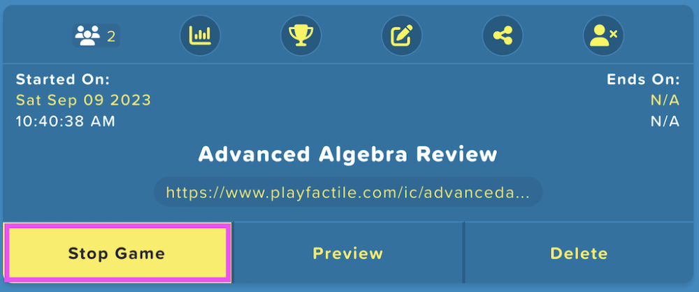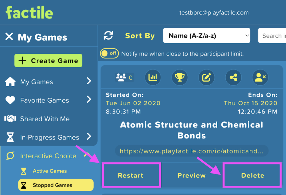 Restart. You can also re-activate the game and share it with your participants to play. Once a game is restarted, it will be moved back to the All Active Games section.