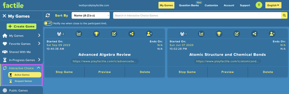 You can click All Active Games to view all active and ongoing Interactive Choice mode games. These games are still open for your participants to join and play. You can do different things to manage these games, such as: