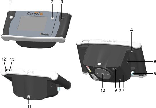 7. „Akkufach-Deckel“: Hinter dem Akkufach-Deckel befindet sich der Lithium-Ionen-Akku. Der Tausch des Akkus darf nur durch die Fa. Flexijet GmbH oder einen autorisierten Service-Partner erfolgen.
