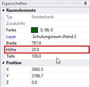 - Die Fensterbank wird mit einer Standardstärke von 20 mm eingefügt und kann durch Anklicken in den Eigenschaften nach Wunsch angepasst werden.