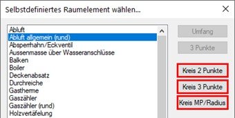 Jetzt hast du die Wahl das Raumelement über die drei Methoden „Kreis 2 Punkte“, „Kreis 3 Punkte“ und „Kreis MP/Radius“ (MP=Mittelpunkt) einzumessen.
