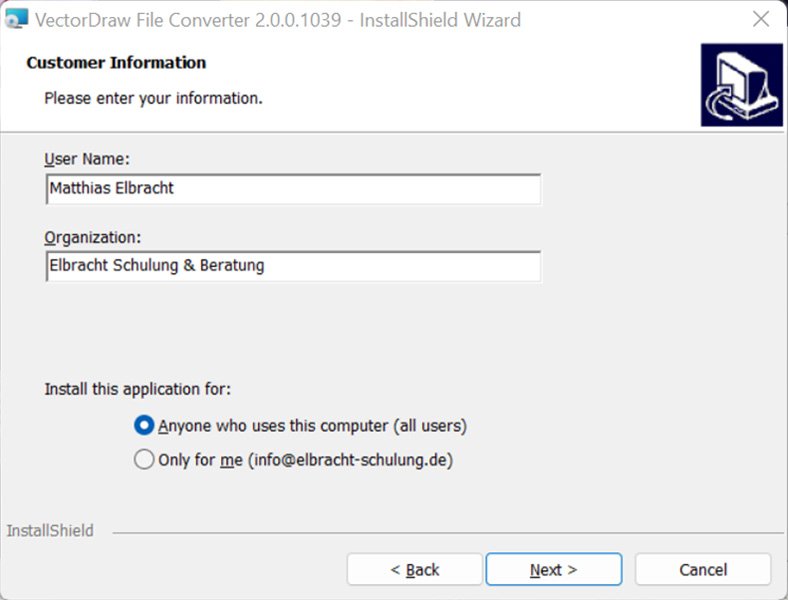 - Trage deinen Namen und deine Firma ein. Entscheide, ob jeder der diesen Computer nutzt die Software starten darf.