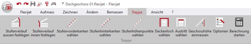 Das eigentliche Aufmaß einer Treppe erfolgt durch die Befehle aus dem Reiter „Flexijet“, „Aufmaß“, und „Zeichnen“.
