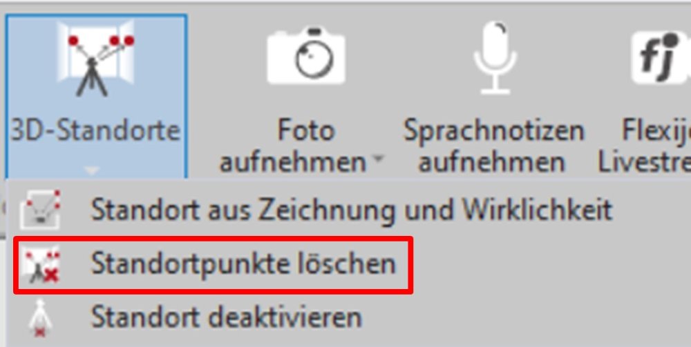 Die Funktion kannst du nur im FlexiCAD durchführen. Wähle im Menü „3D-Standorte“ den Befehl „Standortpunkt löschen“.