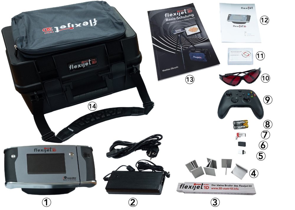 Flexijet 3D ist in dem robusten Koffer sehr gut vor Staub und kleinen Stößen geschützt. Aber wie mit allen hochpräzisen Messinstrumenten, solltest du damit ent-sprechend sorgsam umgehen.