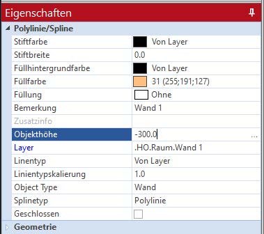 Es ist darauf zu achten, dass die Objektehöhe mit “-” 300 angegeben werden muss,