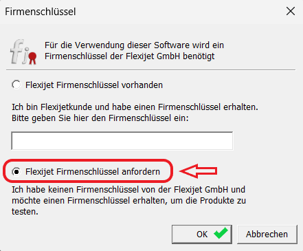 Sie hier bitte die Option „Flexijet Firmenschlüssel anfordern“ und bestätigen