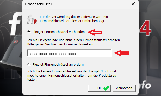 „Flexijet Firmenschlüssel vorhanden“. Tragen Sie den neuen