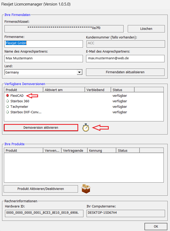 “Verfügbare Demoversionen“, mittig im Lizenzmanager, „FlexiCAD“ aus