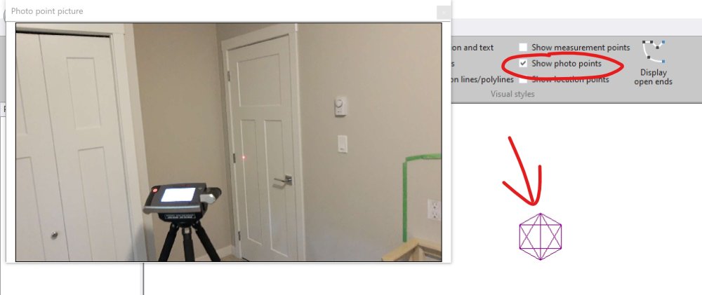 - The ‘Photo with Measurement Point’ button captures a measurement point from the Flexijet 3D laser and attached the picture captured by the selected camera at the same time. These photo points appear as blue spheres in your project, and can be viewed by selecting the ‘Show photo-points’ option on the ‘View’ ribbon.These photos can also be captured used the Flexijet Smart Remote App on a compatible smartphone.
