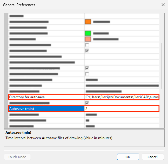 The General Preferences window allows you to select the directory for these Autosave backup files and the time between auto-saves.
