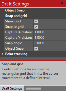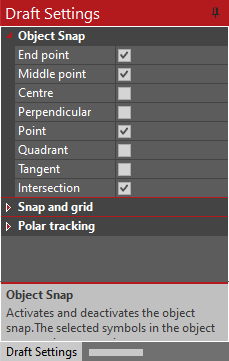 - When you start FlexiCAD, certain basic settings are predefined and can be adjusted as required. Look at the window Draft Settings on the left side. Ensure the Properties window is visible, click left on Draft Settings (at the bottom of the window). From here, you may select the Object Snap settings you wish to turn On/Off.