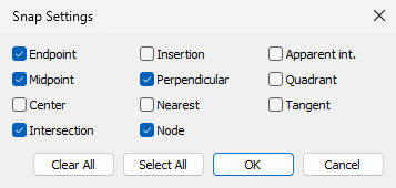 - The selected snap options are generally active and don’t have to be selected via the snap functions in order to use them.