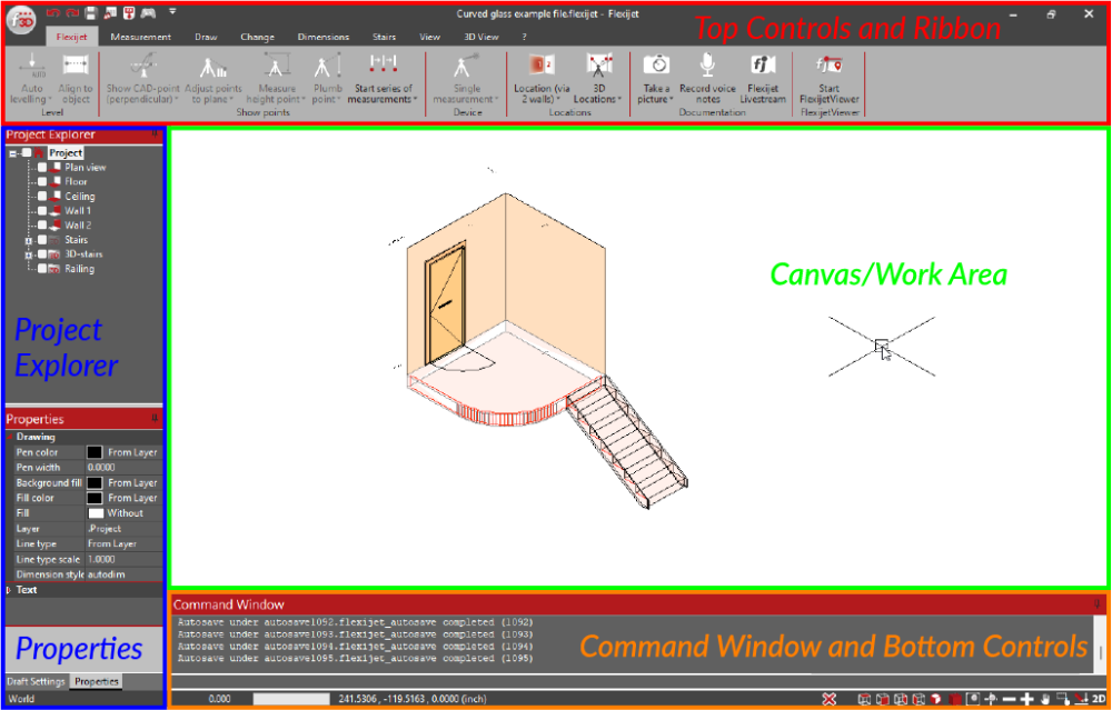 This is where the measurement drawing will be created and edited. In Touch Mode, pinch-to-zoom and move the canvas with a single-held touch. In PC mode, scroll in and out on the mouse to zoom, and click and move the centre scroll wheel to move the canvas. - Command Window & Bottom controls (View and Transport)