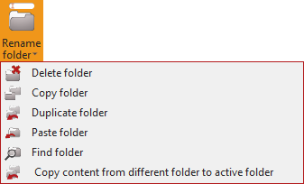 Additional folder options are available from the drop-down under ‘Rename folder’, including Delete folder, Copy and Paste folder (duplicate folder), Find folder, and Copy content from different folder to active folder.