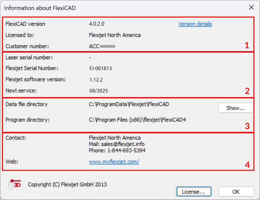The _About FlexiCAD – dialog shows the next recommended service date, providing a quick and easy overview of your system’s maintenance needs. In addition, includes the contact information of your contact person so that you can get help quickly and easily. |