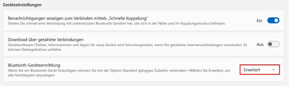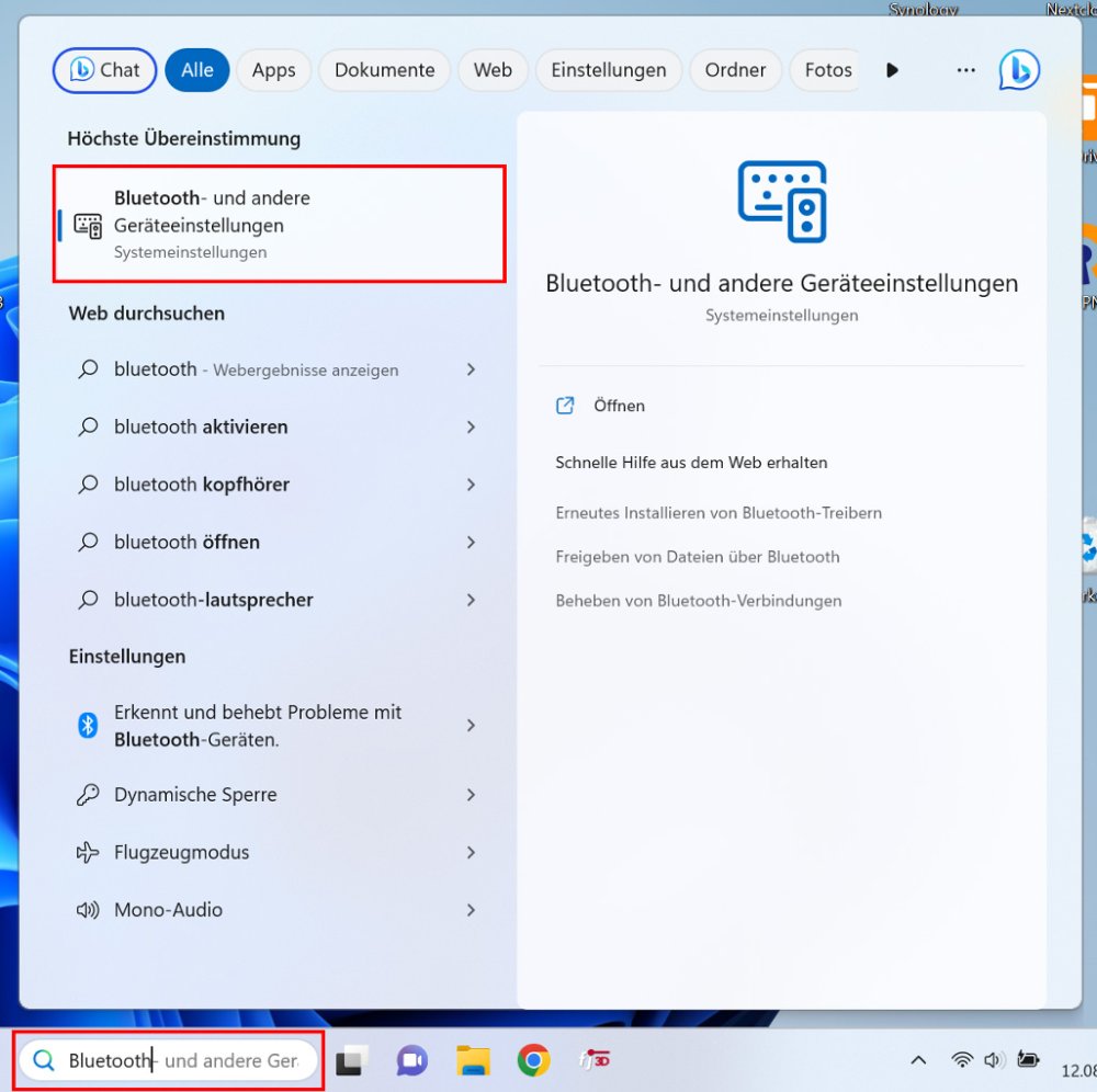 - Klicke in das Windows 11 Suchfeld und gebe „Bluetooth“ ein. Wähle dann „Bluetooth- und andere Geräteeinstellungen“.