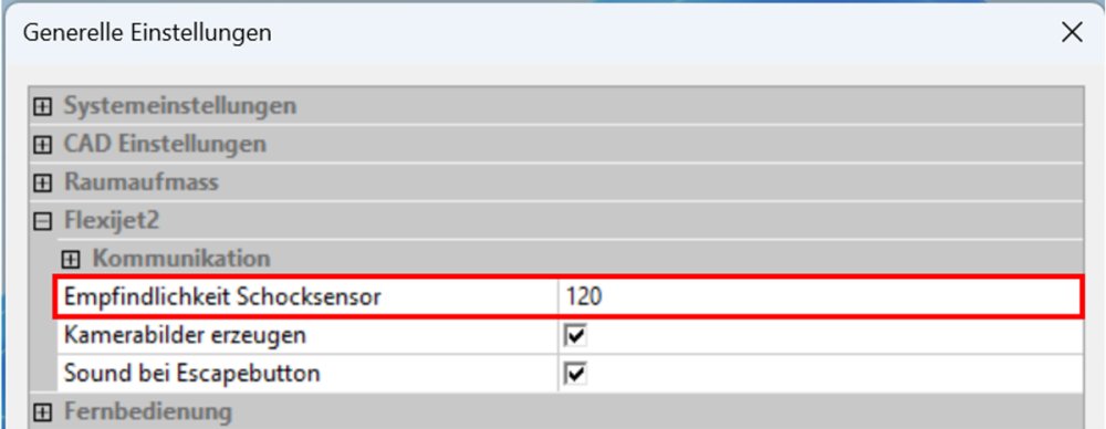 Im Bereich „Flexijet2“ kann unter anderem der Schocksensor eingestellt werden. Je höher der Wert ist, desto unempfindlicher ist dein Flexijet 3D. Der Schocksensor sollte nicht höher als 360 eingestellt werden. Flexijet merkt sich deine geänderten Einstellungen.