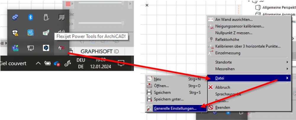 Im Windows System Tray steht nun die Schaltfläche „Flexijet Power Tools for Archicad!“ zur Verfügung. Mit einem Klick auf diese Schaltfläche öffnet sich ein Menü, in welchem du unter dem Punkt „Datei“ die „Generellen Einstellungen“ aufrufen kannst.