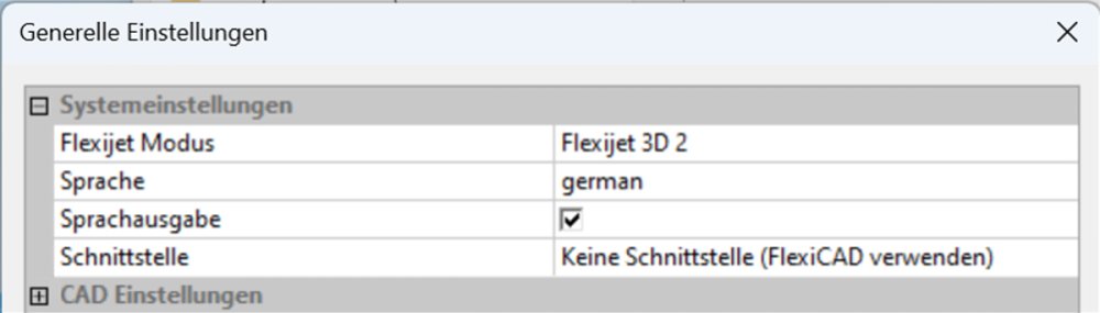 Die ersten generellen Einstellungen hast du nun bereits im letzten Kapitel (4.5) getroffen. Dazu gehört der „Flexijet Modus“, welcher für Flexijet 3D Geräte der Baureihe 1 auf den Wert „Flexijet 3D“ oder für Geräte der Baureihe 2 („Next Generation“) auf den Wert „Flexijet 3D 2“ einzustellen ist.
