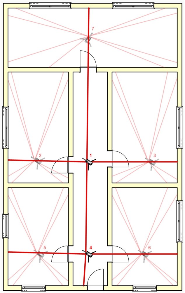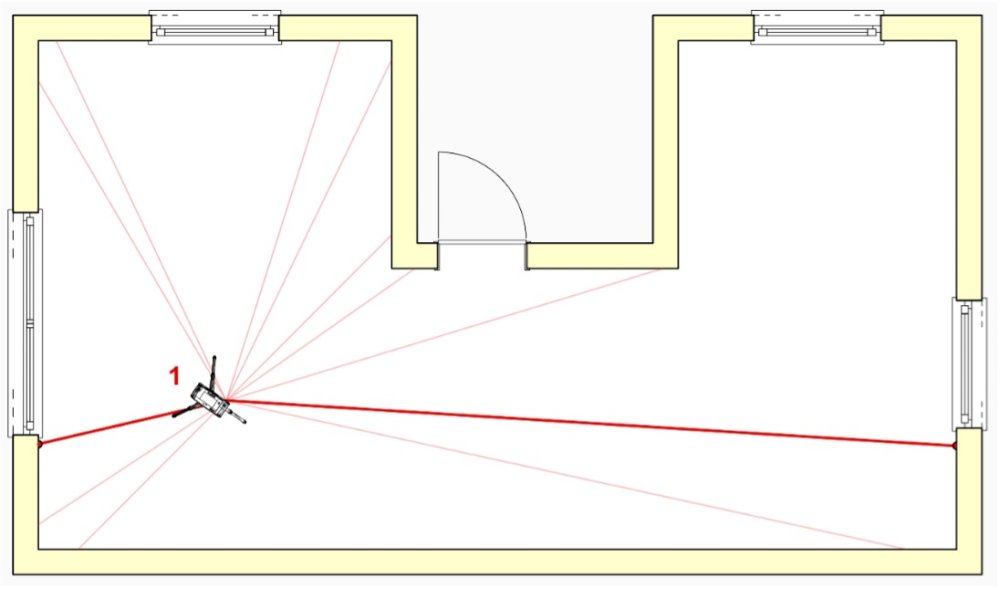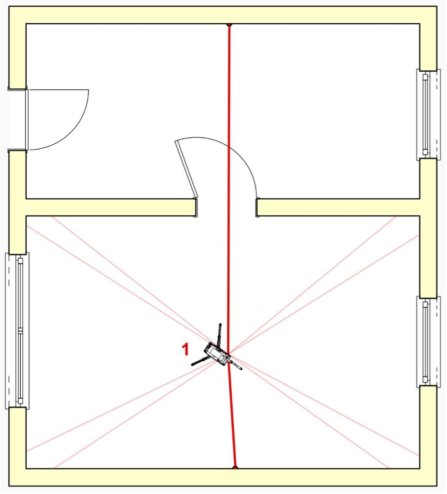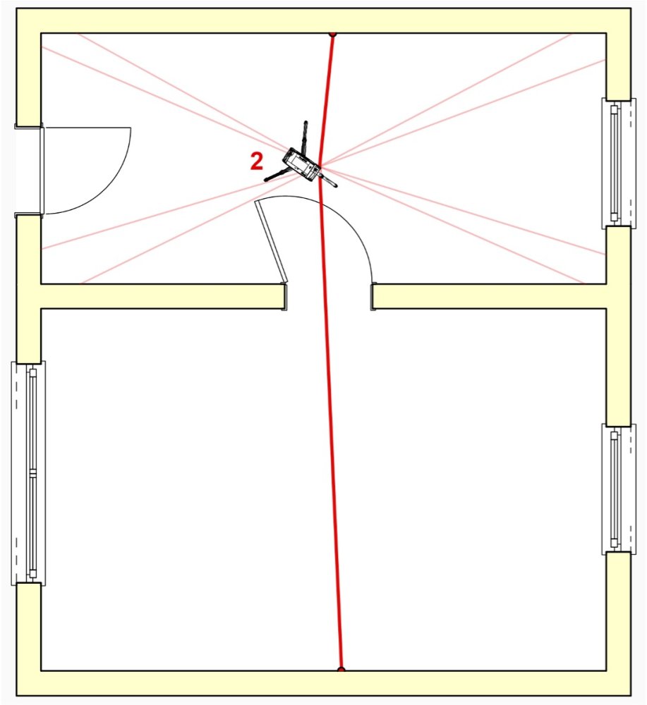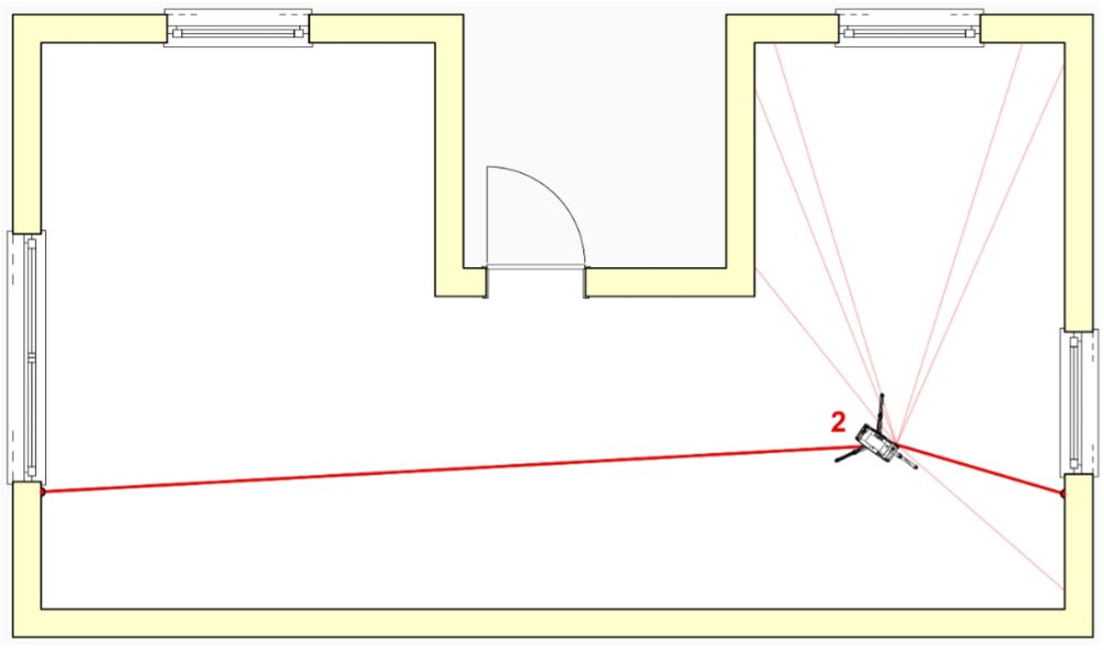 Der U-Förmige Raum soll komplett aufgemessen werden. Am Standort 1 nehme ich zwei Standortpunkte auf. Dabei achte ich darauf, dass sich diese möglichst gegenüberliegen. So trifft der Laserstrahl im Idealfall mit 90° auf die Messmarke. Es entsteht sozusagen eine „Achse“, auf der ich mein