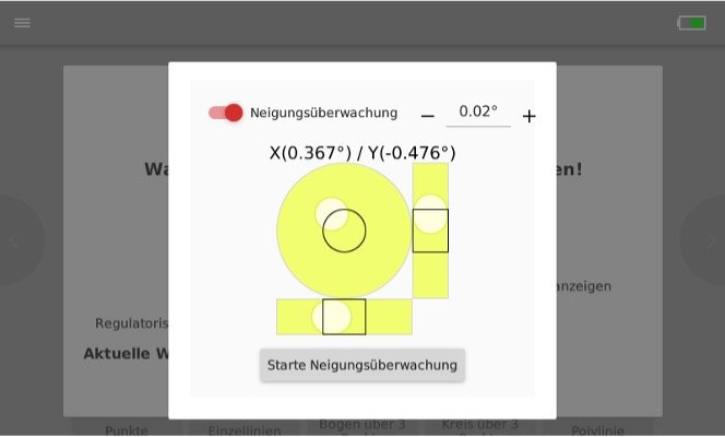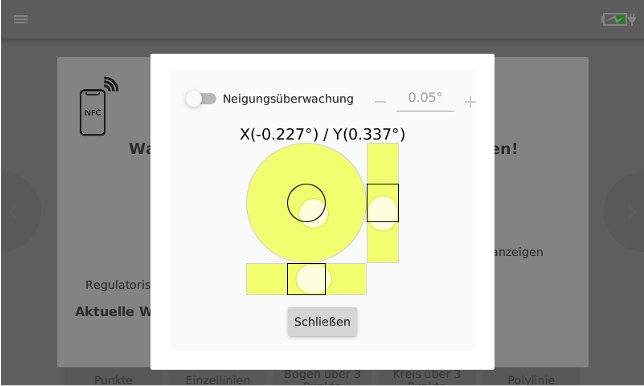 - Wenn du dein Flexijet am neuen Standort aufstellst, kannst du nochmal die Neigungsüberwachung aufrufen. So kannst du überprüfen, ob dein Flexijet einigermaßen im Lot steht. Klicke dazu auf die drei Linien auf deinem Flexijet-Display.