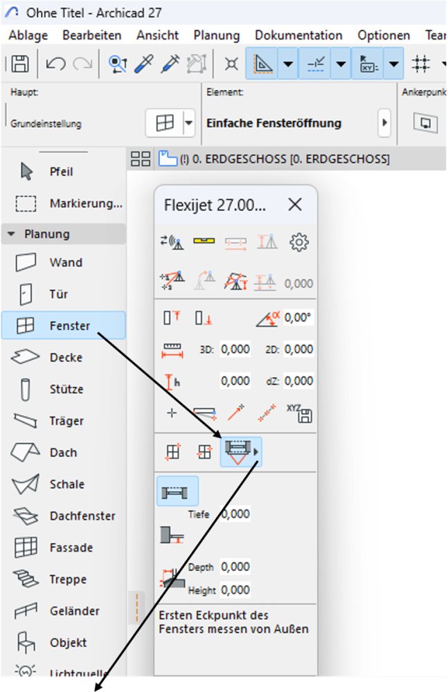- einen Punkt links oben, einen Punkt unten rechts und einen Punkt messen, der die Aufschlagsrichtung des Fensters angibt